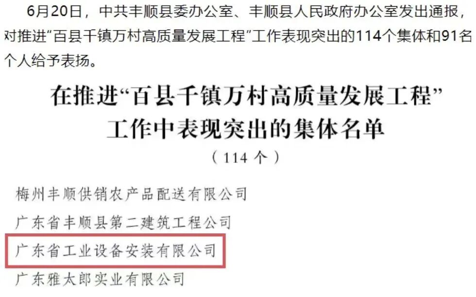 公司入选由中共丰顺县委办公室、丰顺县人民政府办公室发出的推进“百县千镇万村高质量发展工程”工作表现突出集体名单。