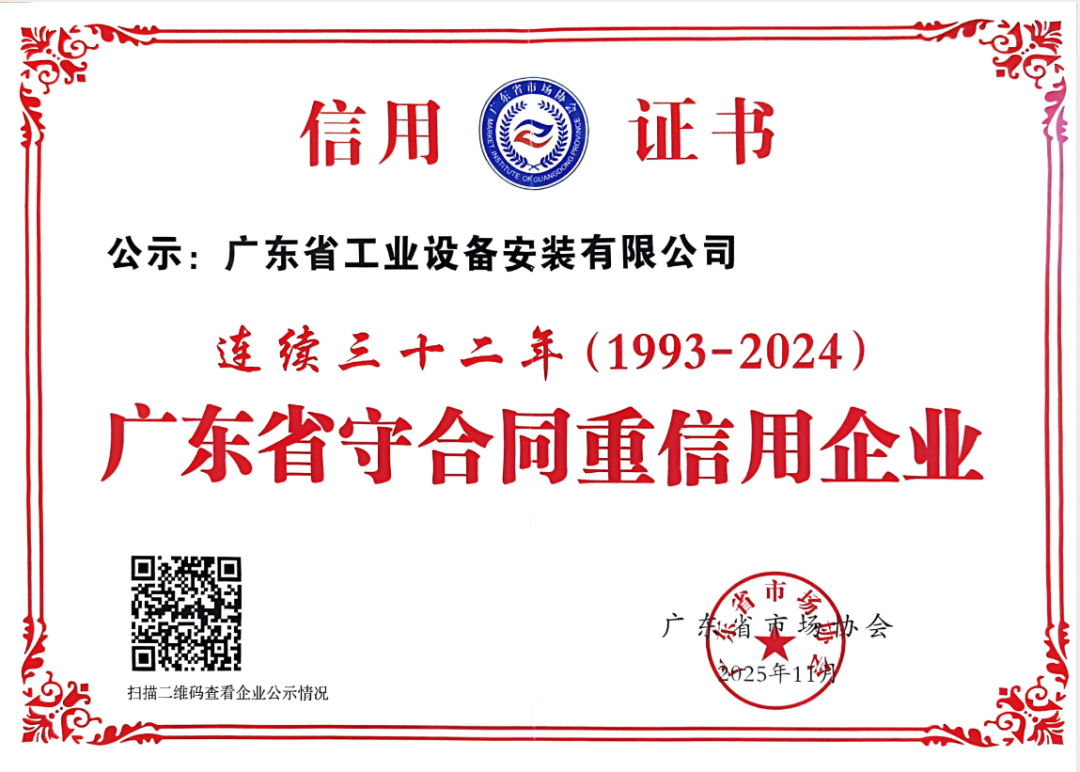 公司凭借良好的信用体系建设,获得了“广东省守合同重信用企业”荣誉称号,自1993年起,公司已连续32年获得该项荣誉!