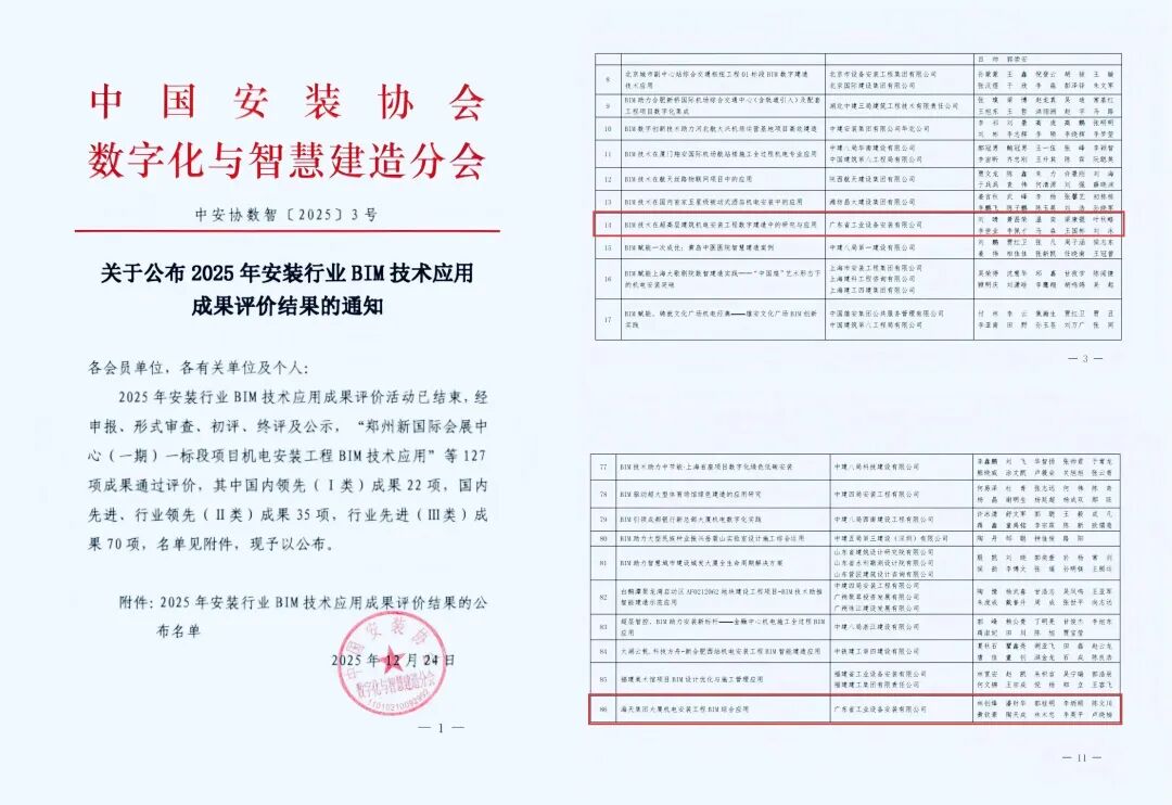 在中国安装协会“2025年安装行业BIM技术应用成果评价活动”中,《BIM技术在超高层建筑机电安装工程数字建造中的研究与应用》(广州国际文化中心)获评“国内领先(I类)”成果,《海天集团大厦机电安装工程BIM综合应用》获评“行业先进(III类)”成果。