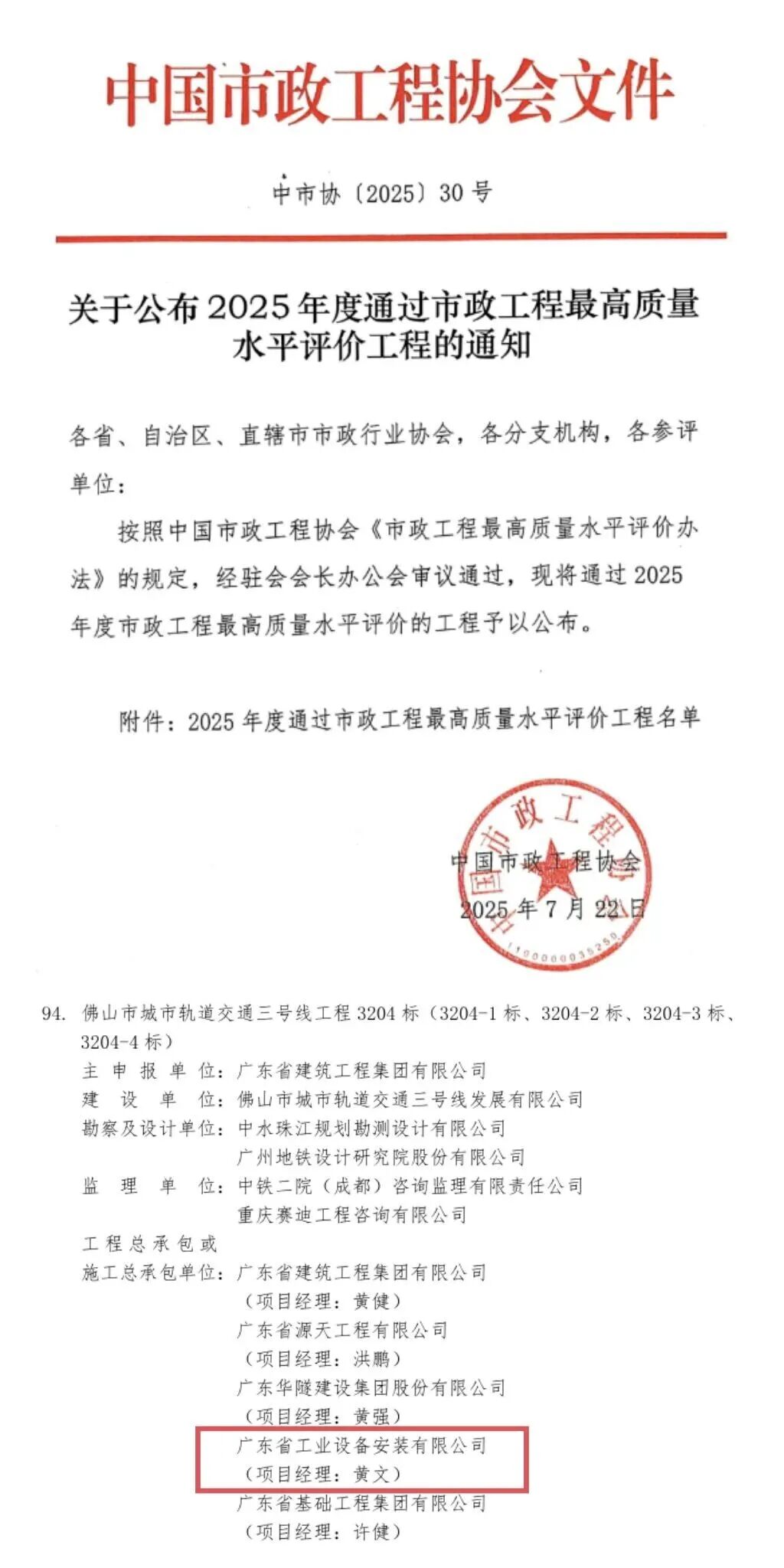 佛山市城市轨道交通三号线工程获评“中国市政工程最高质量水平评价”