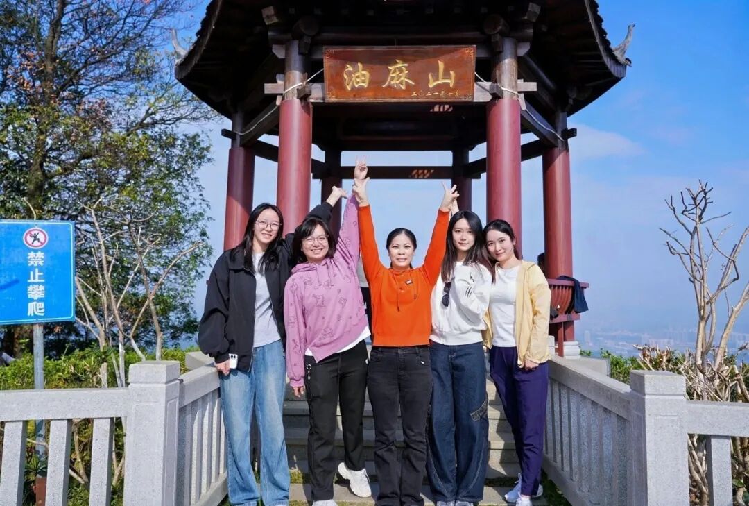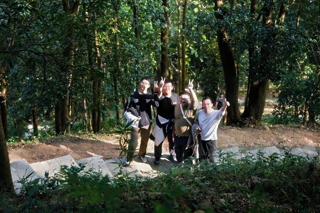 经过近一个小时的奋力攀登,大家陆续抵达山顶,城市美景与山间风光尽收眼底,大家纷纷拿出手机拍照留念,尽情享受登顶的喜悦。