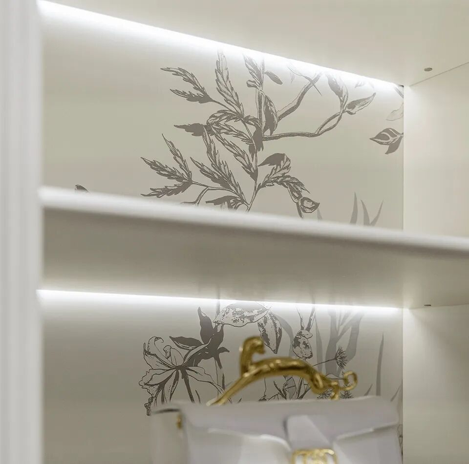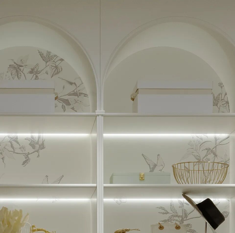 沿袭法式古典拱门的浪漫意象,拱形展示柜与玻璃门巧妙划分空间,让鞋履、包饰与心爱藏品如同艺术馆展品般被有序陈列。