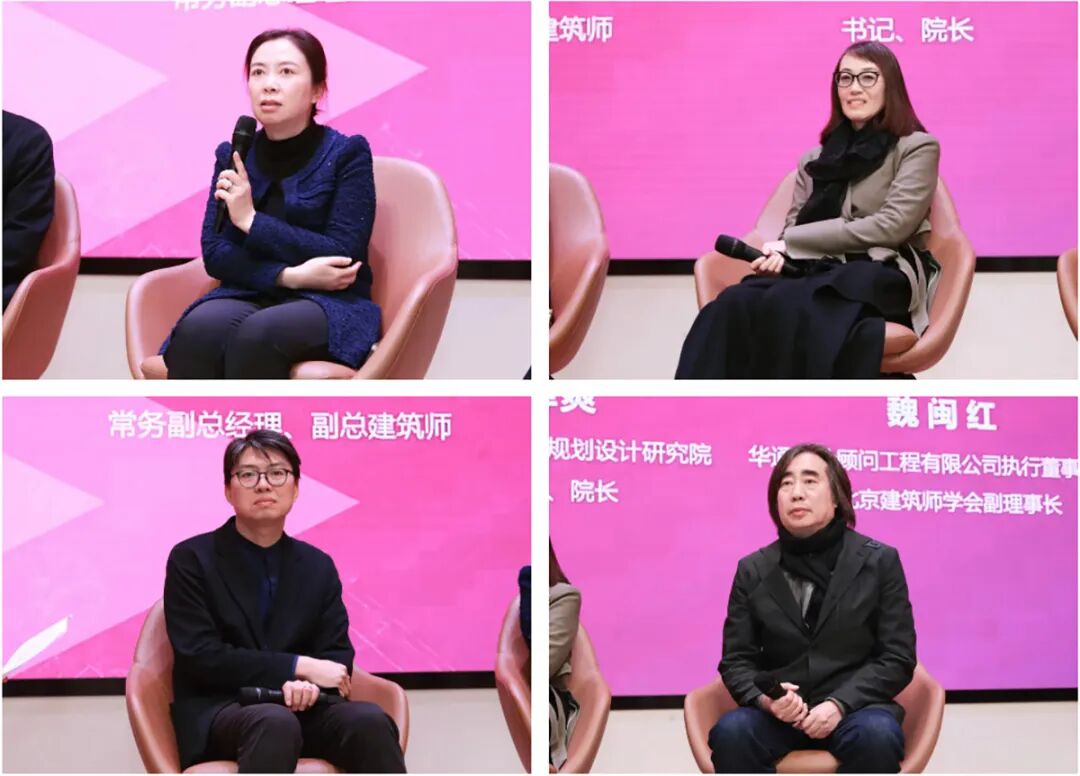 中国建筑设计研究院有限公司常务副总经理、副总建筑师杨金鹏,北京清华同衡规划设计研究院书记、院长恽爽,华通设计顾问工程有限公司执行董事/总裁、北京建筑师学会副理事长魏闽红,北京市建筑设计研究院股份有限公司总建筑师刘淼。