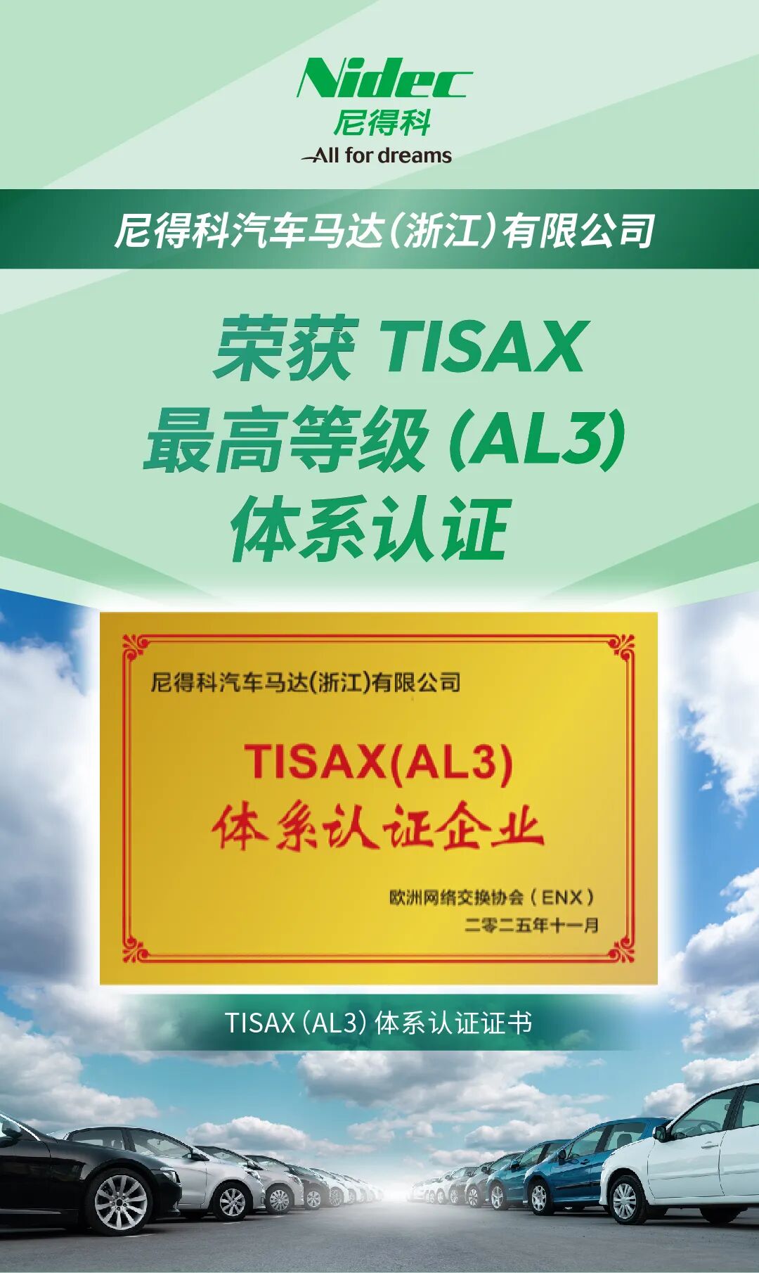 近日,尼得科集团旗下的尼得科汽车马达(浙江)有限公司荣获TISAX最高等级(AL3)认证。凭借在质量、安全、服务三大核心维度的体系化建设,尼得科已构建覆盖全流程的综合优势,该认证将进一步提升尼得科的供应链协同效率,降低运营成本,以更高水准的服务响应全球客户需求,持续为全球客户提供“安全+品质”的双重保障。