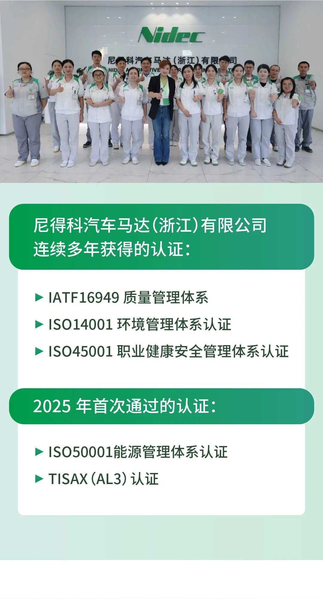 未来,尼得科将以此次认证为新起点,持续迭代升级信息安全管理体系,深化在研发、生产、供应链全链路的安全防护能力,与全球合作伙伴携手共筑安全可信、高效协同的汽车产业生态,为新能源汽车产业的高质量发展贡献力量!