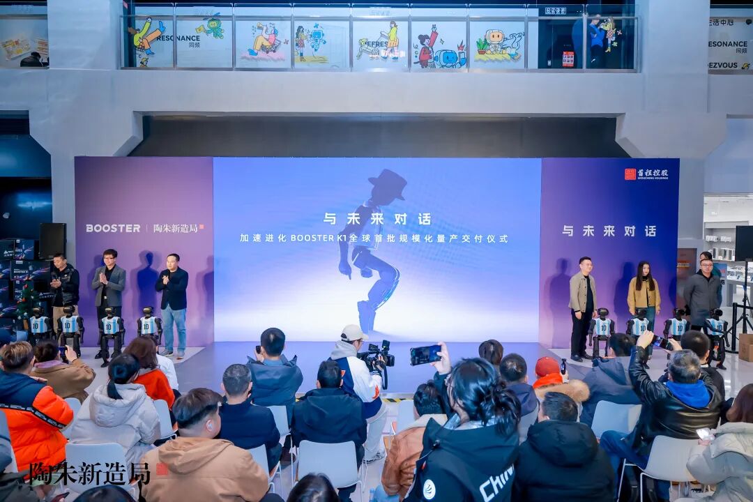 12 月 20 日,加速进化Booster K1全球首批规模化量产交仪式在首钢园融石广场圆满举行。本次活动由陶朱新造局主办,海淀及石景山相关部门领导、首程融石董事长兼CEO张檬,首程控股联席总裁兼陶朱新造局负责人叶芊、加速进化 CEO 程昊、行业合作伙伴及媒体代表齐聚现场,共同见证这一里程碑时刻。