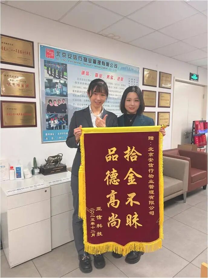 近日,亚信科技行政人员向北京安信行物业管理有限公司亚信项目物业团队赠送“品德高尚·拾金不昧”锦旗,这既是对团队善举的感谢,更是对其“品德筑基、效率为翼”服务理念的高度认可。