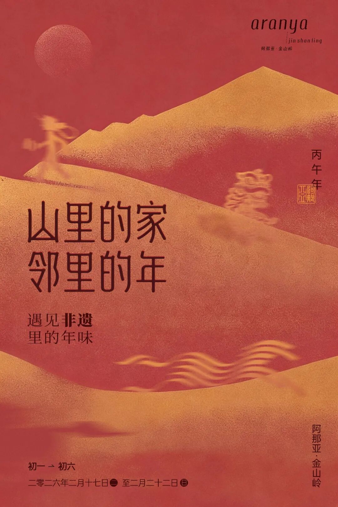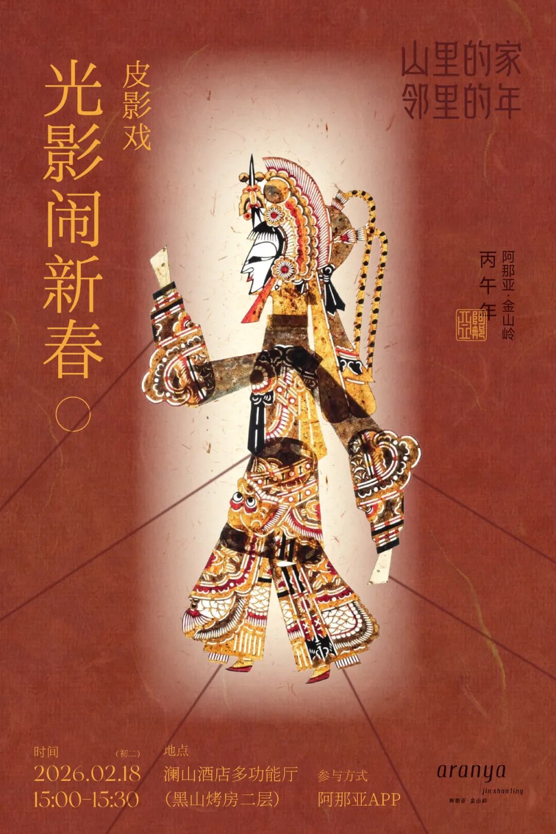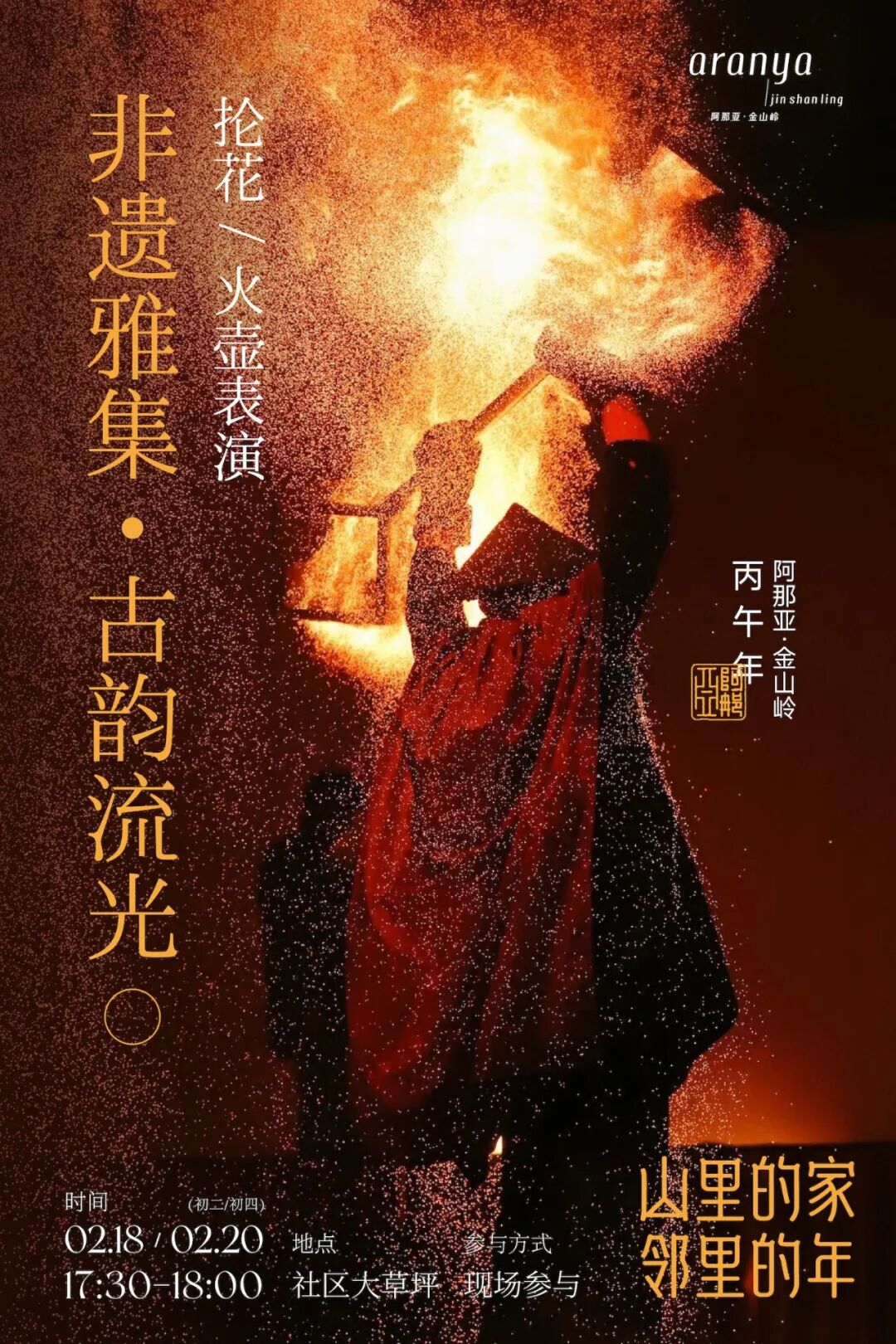 新年最动人的,永远是人与人的相聚和重逢。与邻居一起包饺子;家人齐聚照全家福;手作花灯、围炉煮茶……回归温暖的人间烟火,珍藏团圆的美满时光。山居的冬日,还蕴藏着无尽的活力。冰上滑行、岩壁攀登、踏雪访古……动静之间,开启身心与自然的酣畅对话;积蓄能量,准备迎接即将苏醒的春天。新春将至,阿那亚·金山岭已准备好所有的暖意与精彩,诚邀大家回到山里的家,与亲人、好友、邻居相约,共赴一场团圆、温暖、趣味盎然的中国年!锣鼓声响,震彻层峦,唤醒了蛰伏一冬的山谷春意。金龙昂首,瑞狮腾跃,带着千年的祥瑞,踏福而至。在铿锵的节奏里,非遗的活力与山野的灵气共舞,让新春的第一缕喝彩,响彻云端。在舞龙舞狮体验课上,人们还能亲手执掌龙首狮头,感受这份热闹背后的温度与重量。邻里接力,默契配合,举擎、奔跑、摇摆,让古老的传统成为可触、可感的新春仪式。在动静之间,感受非遗文化在山中绵延不息,让团聚与欢腾,成为山居年味里最生动的篇章。方寸戏台,藏尽中式奇幻。指掌翻覆间,古彩戏法以虚写实,信手拈来新春的吉庆;袍袖飞扬处,变脸绝技以快写意,瞬息幻化百态人生。非遗之妙,在于亦真亦幻,亦庄亦谐。古老技艺的智慧与幽默,让人在屏息与惊叹间,化作满堂会心的喝彩。铁水腾空,化作满天星雨;火壶流转,舞动不夜银花。源自民间的焰火艺术,承载着古人对光明最炽热、最浪漫的想象。当万千璀璨照亮夜幕,与山谷的静谧星空交相辉映,“火树银花不夜天”的古老诗境,在此刻化为真实的震撼。邻里亲友,并肩仰望,让流淌的光焰凝固时间,将这份绚烂夺目,深深镌刻进山谷的新春记忆之中。时间:2月18日(初二)、2月20日(初四) 17:30-18:00三尺生绢,绘就宇宙乾坤;十指灵动,召唤古今传奇。