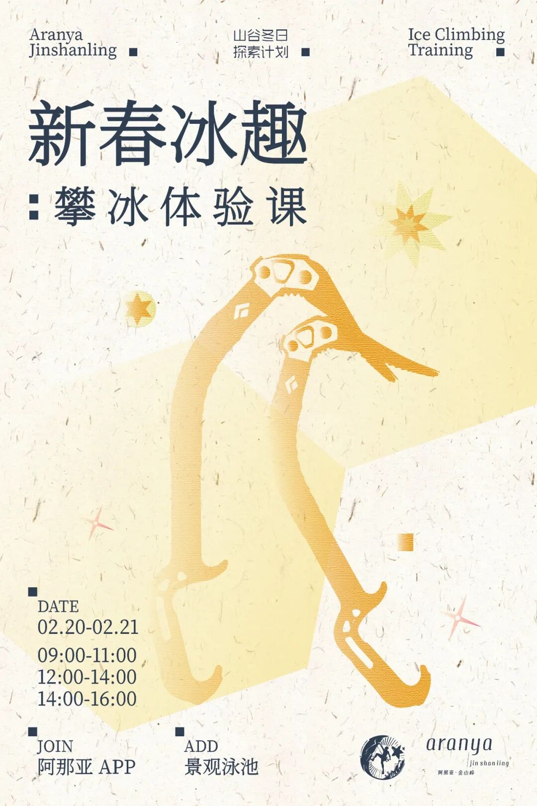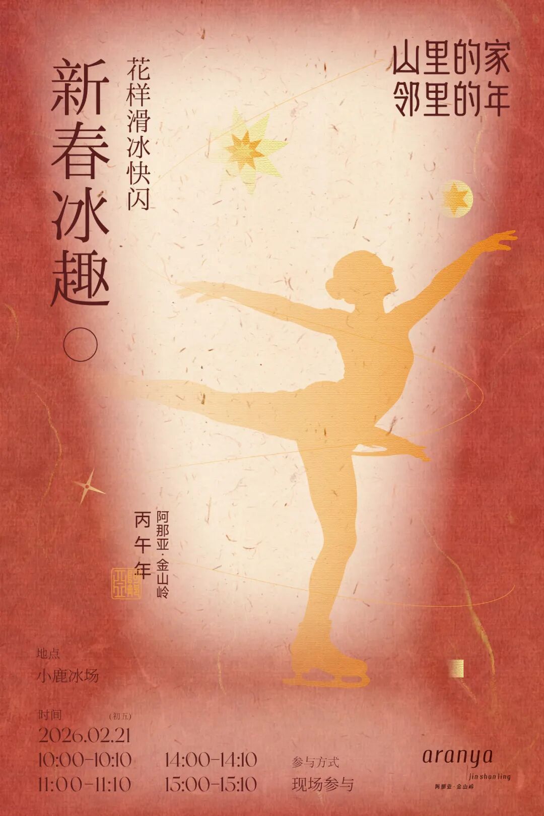 丙午马年,我们特别邀请友邻秋秋,带领大家步入「素箔锡纸画」的艺术世界。无需画笔,双手就是最灵动的工具。通过捏塑、刮划、折叠,平凡的锡箔在指尖获得新生,化为一匹昂首奔腾、奔向春光的骏马,成为一份独特而有趣的新春纪念。时间:2月19日(初三)-2月22日(初六) 11:00-12:00新春初五,山谷的小鹿冰场上,多场花样滑冰快闪将惊喜呈现。花滑者们时而如风般掠过,划出优雅弧线;时而翩然旋转,跃动于清冽的空气之中。这是一场即兴的冰上芭蕾,是力与美的瞬间绽放,为冬日山居增添一抹迅捷而优雅的活力。10:00-10:10、11:00-11:10、14:00-14:10、15:00-15:10如果滑冰是冰面上的舞蹈,那么攀冰便是一场向上的垂直探索。面对晶莹冰壁,人们在专业指导与装备保护下,运用冰镐与冰爪,将身体贴近这份极致的寒冷与美丽。每一次镐尖的精准叩击,都是对自我专注力与勇气的考验,唤醒内心沉睡的活力与热情。9:00-11:00、12:00-14:00、14:00-16:00无论长幼,都能在国际象棋营中享受一场纯粹而深刻的“脑内瑜伽”。从规则入门到策略精研,在黑白格的推演间,锻炼逻辑,激发想象,以沉静而睿智的方式,开启新一年的精神征途。时间:2月19日(初三)-2月22日(初六) 9:30-20:30地点:一期129-3(原置业中心 y MOUNTAIN旁)
