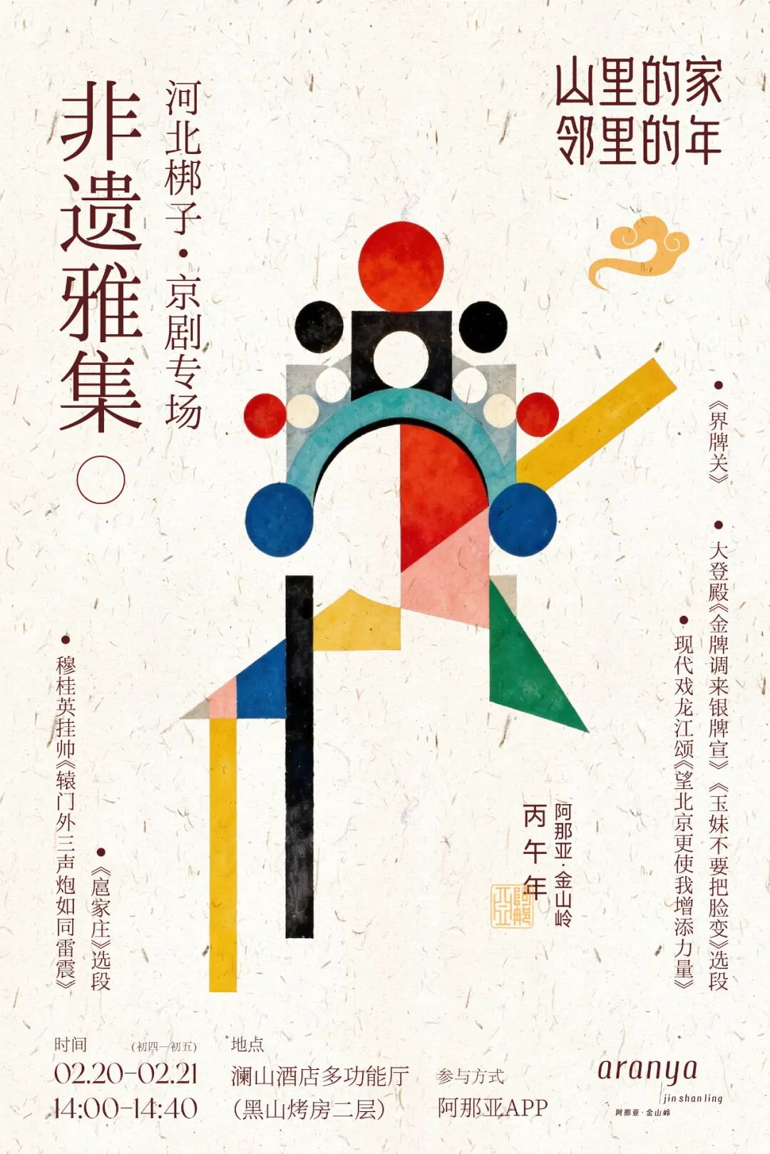 当暮色四合,一场关于光的奇幻仪式悄然开启。盒子灯,层层堆叠,内藏玄机,如一朵火焰之花,每一次引燃,都带来一次全新的绚烂图景,亭台楼阁、花鸟人物在夜空中渐次浮现,惊艳绽放。每一束升腾的光焰,都是一份寄往春天的心愿。与邻里家人一同观赏、祈愿,看非遗星火点亮长夜,愿山谷的祝福,照亮崭新的一年。一方舞台,能纳山河万里;几声锣鼓,可定千军万马。这里既有巾帼英雄穆桂英挂帅的冲天豪气,也有宫廷生活的百态纷繁。让我们在唱、念、做、打中,品味“四功五法”的严谨法度;在水袖、翎子、髯口的飞扬翻舞间,领略写意美学的无尽韵味。与邻共坐,沉浸于这方寸天地中的万千气象,让悠扬的皮黄声腔与梆子韵律,为山谷新春,注入一份荡气回肠的文化厚度。曲目:穆桂英挂帅《辕门外三声炮如同雷震》、《扈家庄》选段曲目:《界牌关》、大登殿《金牌调来银牌宣》、《玉妹不要把脸变》选段、现代戏龙江颂《望北京更使我增添力量》年味,在亲手创造的仪式感中愈发浓郁。从除夕到初五,这间常设的手作客厅将化身为温暖的社区工坊。与家人邻里围坐,剪一幅寓意吉祥的窗花,写一对墨香盈袖的春联,扎一盏独一无二的花灯。让新春的祝福,通过亲手制作的心意,传递到山居的每一个角落。时间:2月16日(除夕)-2月21日(初五) 10:00-16:00面团揉进新春的暖意,馅料拌入团聚的欢声,擀开的皮是圆满的期待,包起的馅是丰盈的祝福。邻里亲朋围拢在长桌旁,分工协作,笑语盈盈,共赴一场关于“家”与“年”的温暖仪式。邻居们还可将亲手包好的美食带回家中,与家人共享这份团圆、美满的新春滋味。以山为幕,以松为景,当一家人在镜头前紧紧依偎,时光仿佛在此刻温柔定格。一张全家福,是新年伊始最具仪式感的礼物,让家的温度、年的情意、团圆的美满,凝成了可以触摸、可以珍藏的印记,见证此山此景,温暖岁岁年年。时间:2月17日(初一)-2月19日(初三)13:00-15:00新春的团圆,不止于室内的欢聚,也在于与山川自然的相拥。跟随原住民的脚步,开启一段充满探索和发现的山谷漫步。观赏冬日的山景,辨认动物的踪迹,探寻时光中的长城遗迹。在清冽的空气中,与邻居们并肩出发,探索远山,留下这个新年最清新而深厚的邻里记忆。时间:2月18日(初二)-2月22日(初六) 10:00-12:00山居新春,在说学逗唱间轻快启幕。一袭长衫,一把折扇,相声艺人凭借智慧与幽默,将山居生活的点滴趣事淬炼成令人捧腹又回味无穷的段子,撑起满堂喝彩。在热络与欢腾中,邻里相视会心,开怀大笑,让山谷新年的团圆意、人情味,愈发绵长温厚。时间:2月19日(初三)-2月20日(初四) 15:30-16:00取一管春风入笔,调几许山间清气。看专业老师挥毫运墨,于纸上徐徐铺展一个鸟语花香、生机盎然的灵动世界,每一笔都蕴含着对新春最典雅、最诗意的寄望。