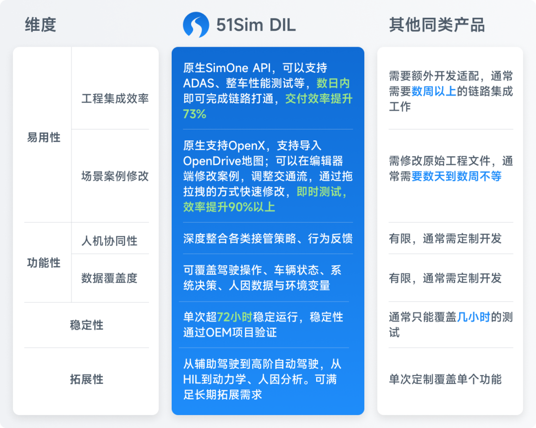 51Sim 的 DIL方案,不只是简单地把“驾驶模拟器 + 仿真软件”拼在一起,而是构建了一套完整的闭环验证体系,这种从系统设计之初就面向工程闭环与量产验证,也形成了其与同类 DIL 解决方案之间最核心的差异: