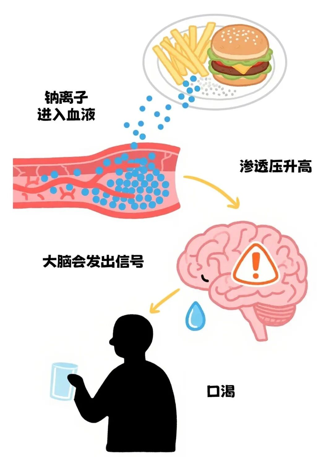 当食物中的钠离子进入血液后,会显著提高血液渗透压。体内钠离子浓度升高时,大脑会不断发出口渴的信号提醒你喝水去稀释血浆、恢复渗透压平衡,导致持续性口渴。