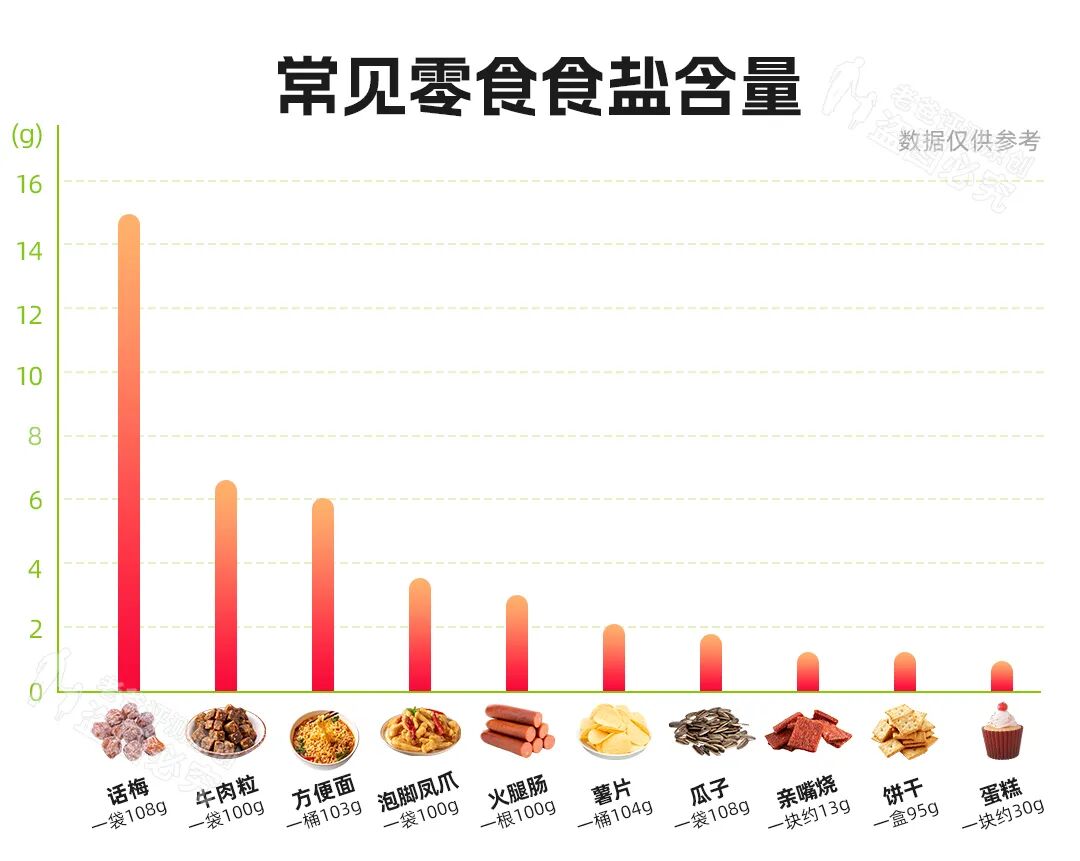 除此之外我们日常生活中不经意吃的零食/加工食品,可能也有很多的盐。