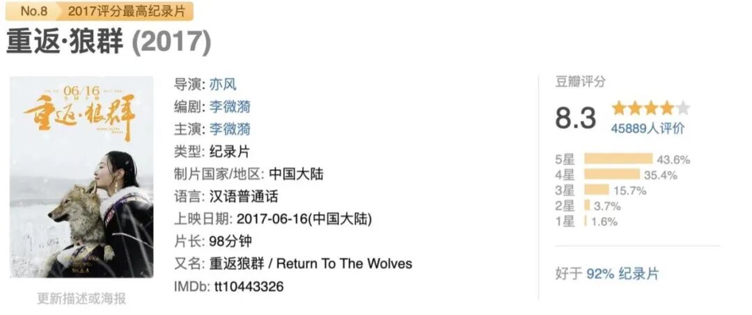 也正是这种被打破的认知,让《重返狼群》这部画质粗糙,镜头晃动的“个人记录”,在时隔九年后的今天,打动无数人。