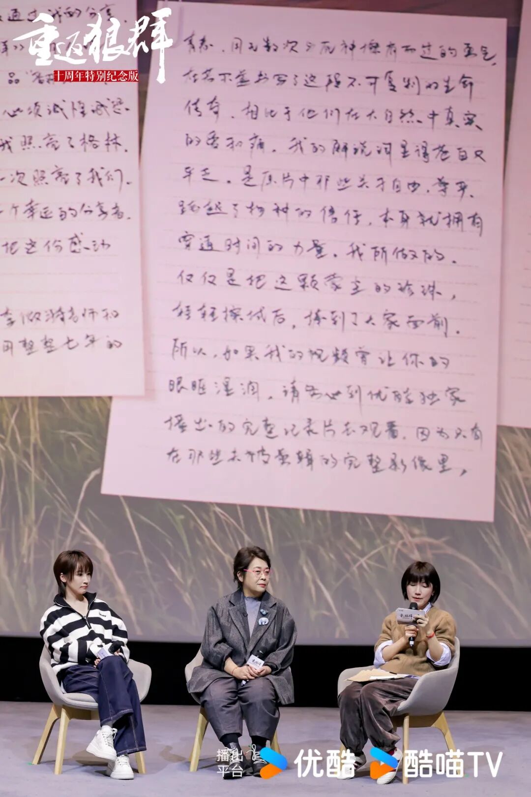 此次放映的《重返狼群10周年特别纪念版》的第12集,是今年1月在优酷独家重新上线的隐藏集中的其中一集,它完整记录了李微漪与亦风重返若尔盖草原,寻访已成为狼王的格林的后续故事,让格林的成长故事更加立体,也让观众们能看到这部纪录片的完整结局。其中李微漪“你在哪里”的深情呼唤、格林“归还红腰带”等名场面被许多观众称为“迟来多年的眼泪”,以丰沛的情感浓度再次击中现场观众的内心,大家纷纷感动落泪。