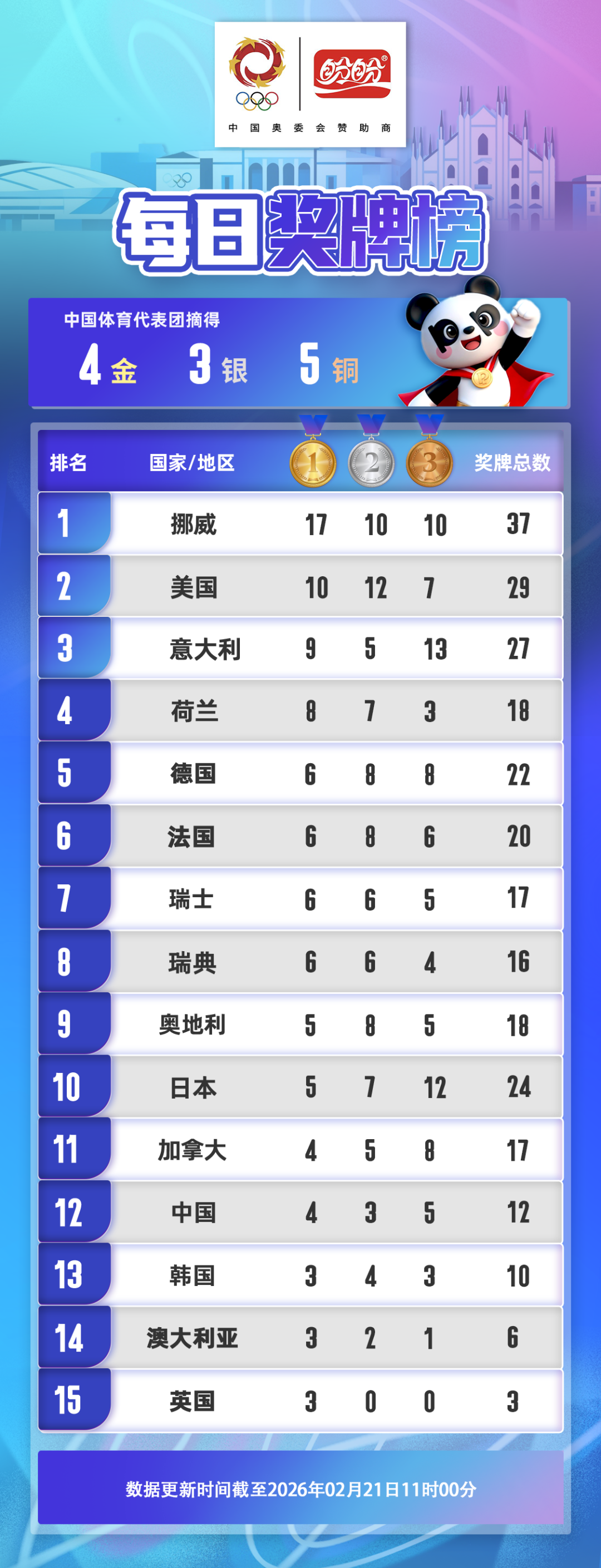 2026年米兰冬奥会奖牌榜(2月21日) | 盼盼食品为中国队助威