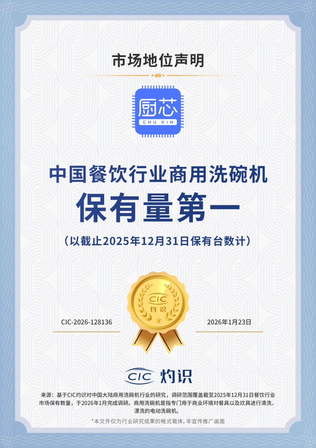 在2026年1月期间,CIC 灼识市场研究(以下简称“CIC灼识”)采用科学、严谨的统计与分析方法,就中国商用洗碗机行业开展了深度调研和专项的系统性研究。基于对中国商用洗碗机行业竞争格局、产品类型、产品功能、渠道分布等方面的详尽调研与深度分析,CIC 灼识确认厨芯科技“中国餐饮行业商用洗碗机保有量第一(截至2025年12月31日)”的市场地位。
