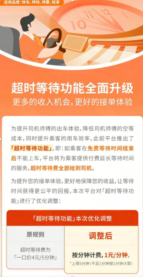 计费更透明:以前超时等待费是“一口价4元/5分钟”,现在按1元/分钟算,上限5分钟,不足1分钟也按1分钟计。比如等2分半就能拿2.5元,彻底告别“等半天一分钱没赚”的尴尬。