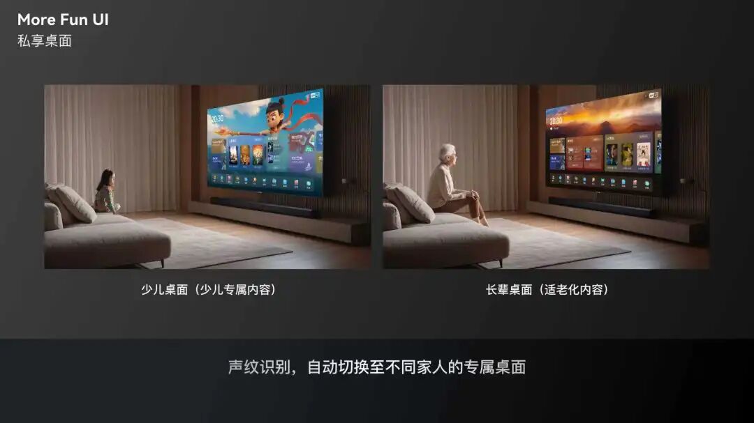 创新没有终点。针对每个家庭的不同用户,魔方桌面还推出了“私享桌面”。“小朋友观看时桌面背景可能是哪吒,当老人观看时可能会切换成风景图片。”长虹电视相关负责人介绍道,依托声纹识别技术,私享桌面可为不同用户推荐专属桌面,根据老人儿童使用状态进行长辈桌面、儿童桌面、标准桌面的快速切换,再基于自研推荐算法并叠加用户观影记录、喜爱标签等信息,在桌面实现“内容追人”的精准推荐。