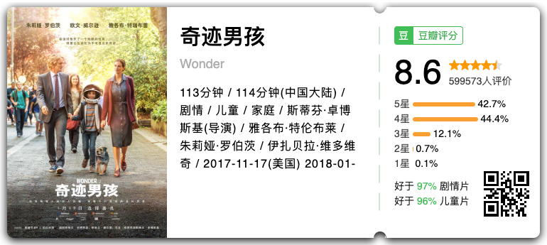 奥吉没有上过学,他的所有文化知识都是母亲伊莎贝尔在家教授给他的。然而,伊莎贝尔渐渐感觉到,家庭课堂无法满足奥吉的成长需要,除了学习知识,奥吉还必须学会的,是如何同除了家人以外的人交流。在忧虑重重之中,伊莎贝尔将奥吉送入了一间公立学校里,在那里,奥吉面临的是他人生中必须要战胜的挑战。桃桃林林:其实这更像当代童话,因为,实在是太暖了。里面每个人都那么暖,怎么可以那么暖,怎么可以那么暖!像一个暖心的童话故事。虽然,我也怀疑这样故事的真实性,但是,却喜欢被这样暖的故事感动,一度哭到不行。