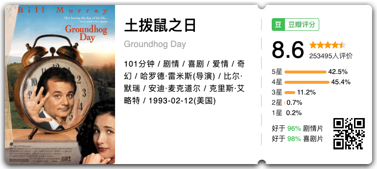 第2天醒来后,菲尔意外地发现时间仍然停留在前一天土拨鼠日,昨日的一切重新上演。惊讶、不信、刺激、狂喜、烦闷、焦虑、不安、绝望、倦怠等各种情绪轮流侵占菲尔的感官领域,可无论他如何选择度过这一天,他都始终无法再前进一步,开始了他重复的人生。趙小漁:怎么把重复的人生过出意义,这太酷了……