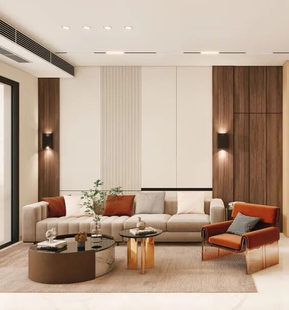客厅以浅原木、奶白与深木色搭建层次,电视背景墙采用悬浮造型搭配木饰面拼接,内嵌氛围灯弱化棱角,以光影与材质营造高级感。