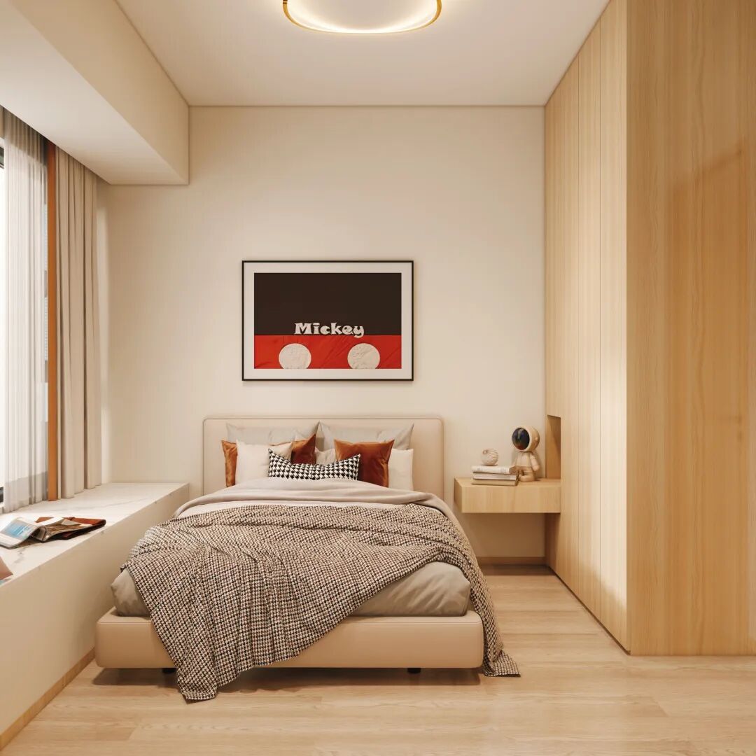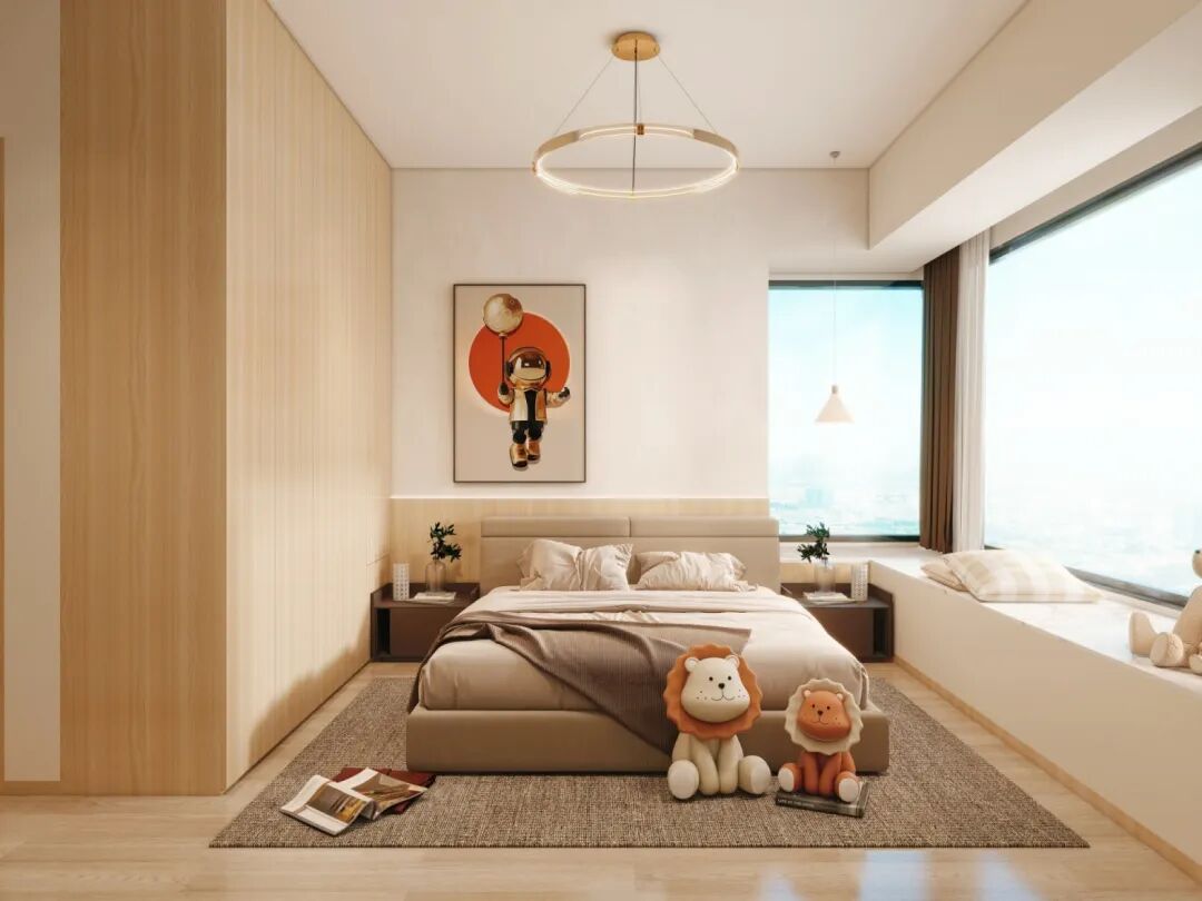 次卧兼顾儿童房与客房功能,灵动又耐看。通顶无拉手原木衣柜收纳力拉满,保持空间整洁。一体式飘窗变身休闲角落,可读可憩,全年龄段适配,温柔又实用。