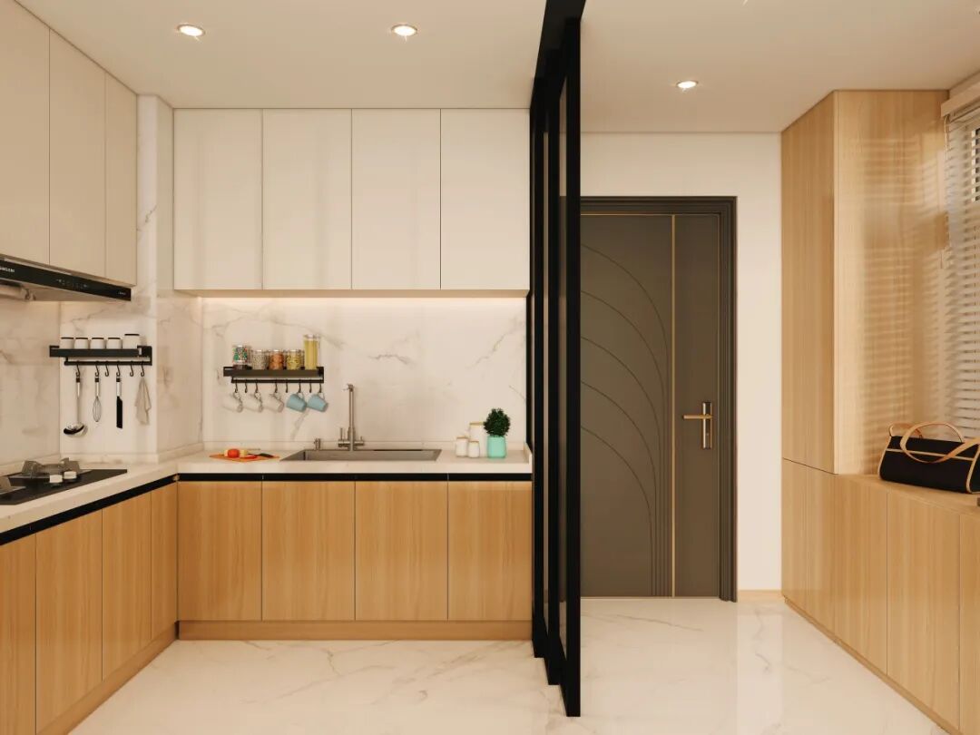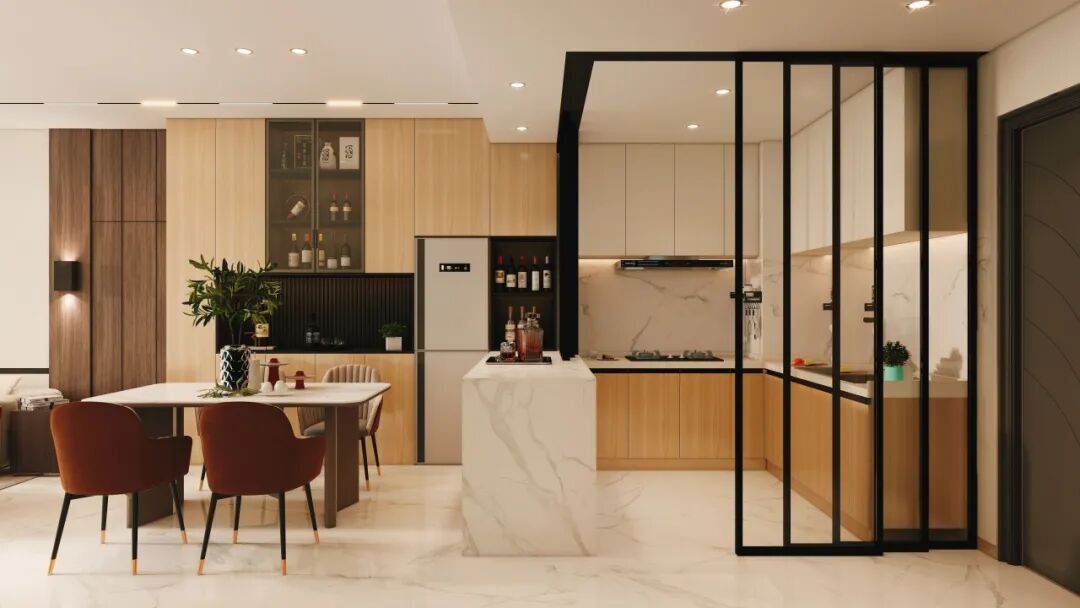 黑色细框玻璃门做柔性隔断,开放时通透,关闭时有效阻隔油烟,适配不同生活场景。