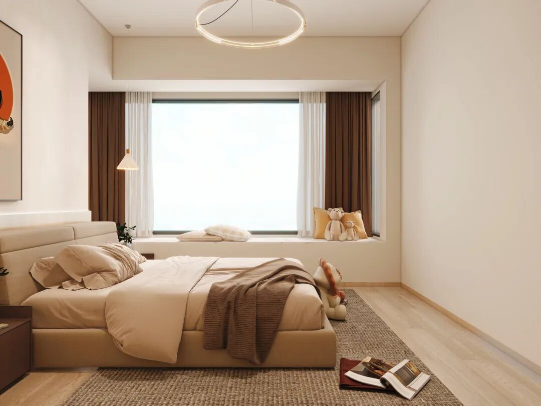 落地窗飘窗改造为休闲角,采光与观景兼得。奶咖与焦糖棕的床品柔化空间,每一处细节都在诉说舒适与温馨。
