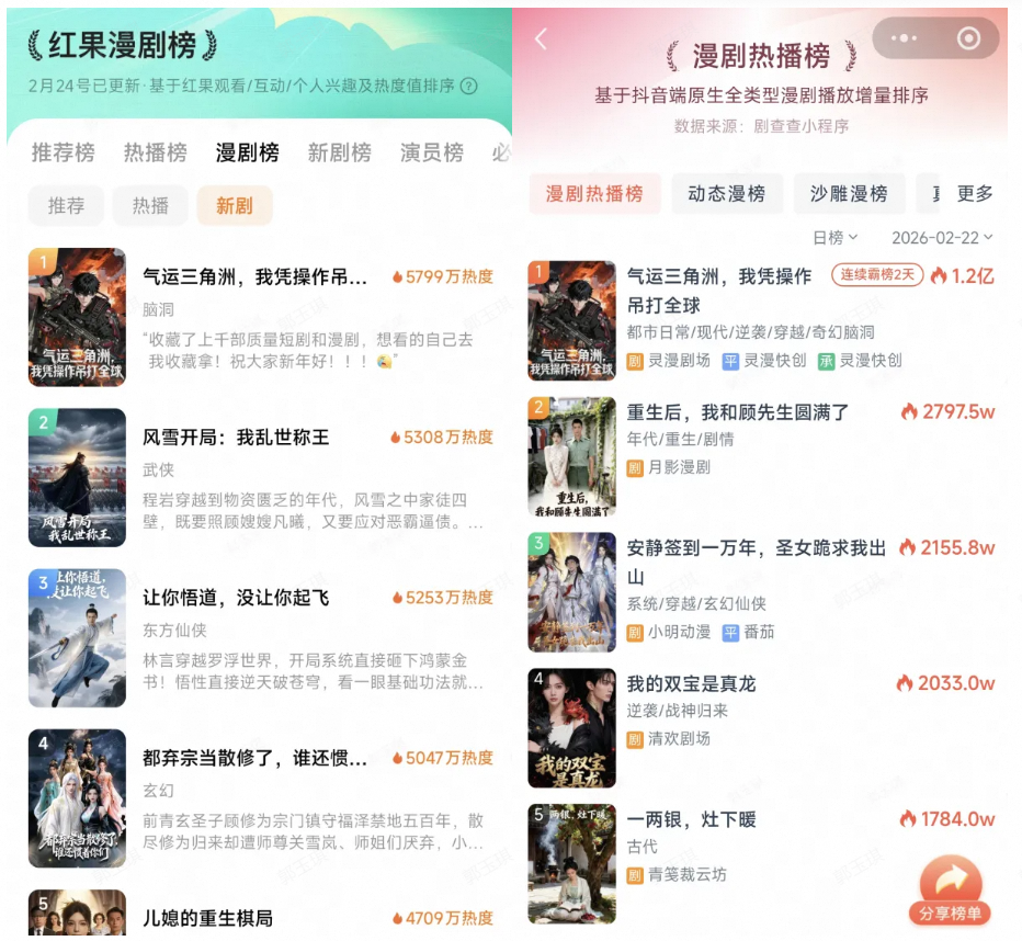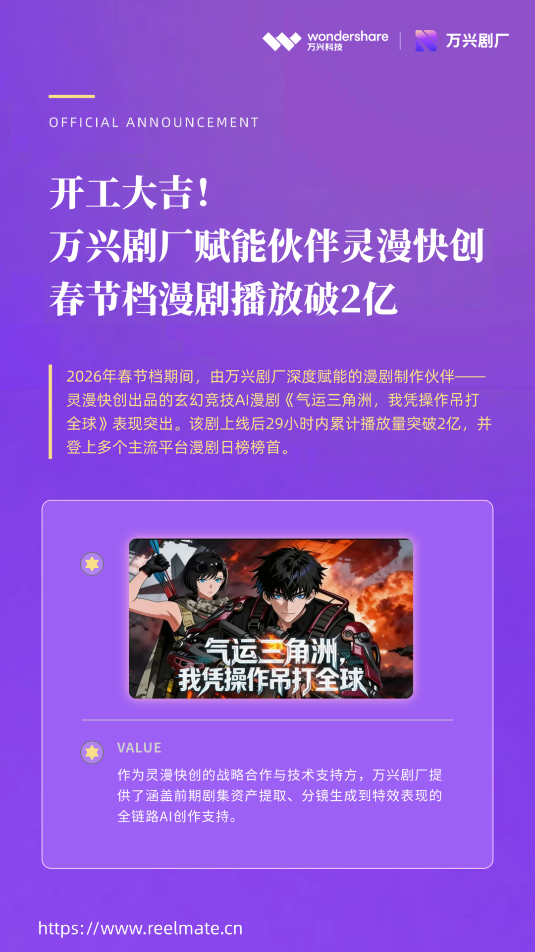 春节档期间,由AIGC软件A股上市公司万兴科技(300624.SZ)旗下AI漫剧一站式创作平台万兴剧厂深度赋能的漫剧制作伙伴——灵漫快创出品的玄幻竞技AI漫剧《气运三角洲,我凭操作吊打全球》表现突出。该剧上线后29小时内累计播放量突破2亿,并登上多个主流平台漫剧日榜榜首。