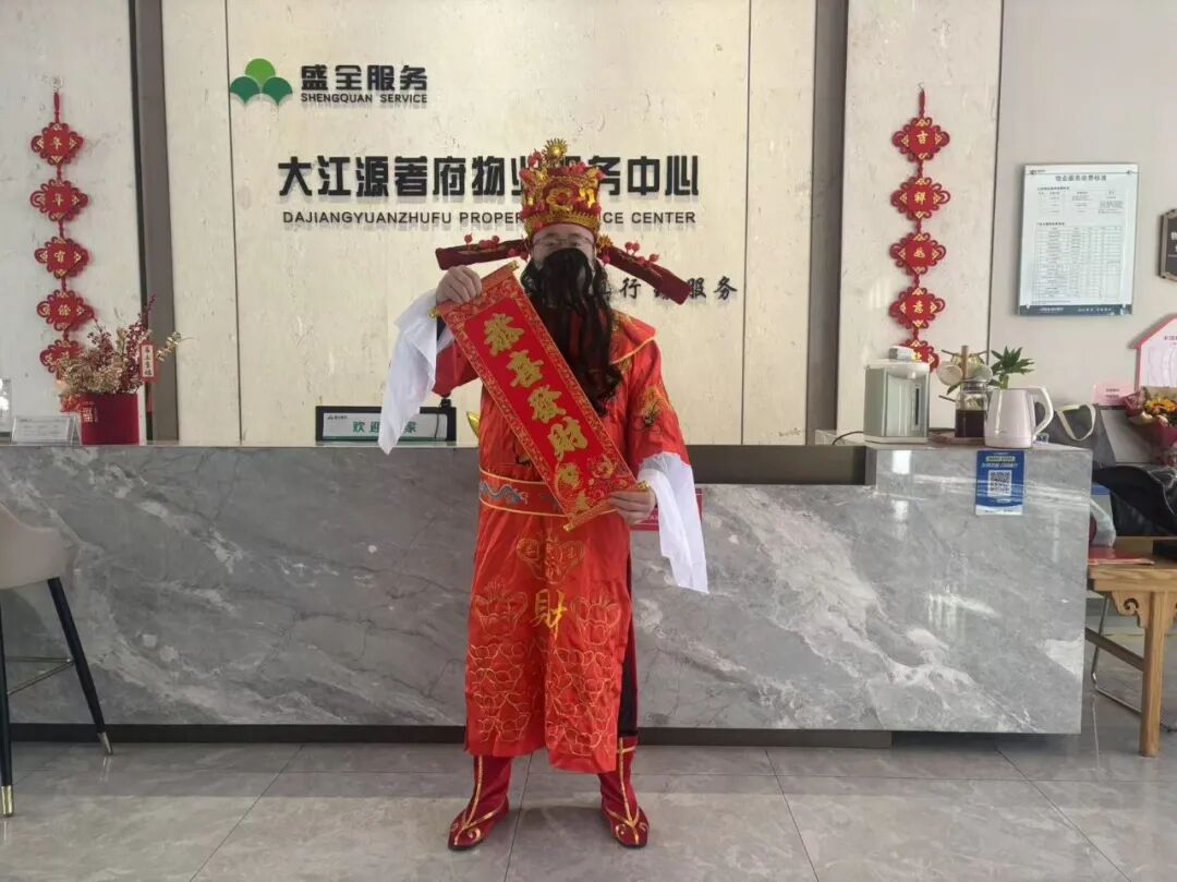 无联不成春,有福岁更安。园区里的写福字、送春联活动如约而至,书法爱好者挥毫泼墨,饱含马年美好寓意的祝福,跃然于大红宣纸上。业主们或驻足欣赏,或亲手提笔,孩子们围在一旁好奇观看,墨香萦绕间,是对新年的无限期许,一张张福字、一副副春联,成为最珍贵的 “文化年货”。物业人员化身 “财神爷”,为来往的业主送上新春祝福,一声声 “新年快乐”“财源广进”,让园区里的年味愈发浓烈。2026春节的这段守护之旅,是物业人无数个平凡日子的缩影——我们不在聚光灯下,却始终在生活的褶皱处;我们的守护,不止于春节,而是365天的如约相伴。