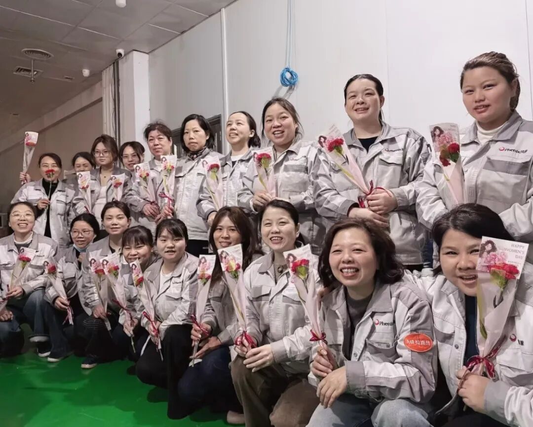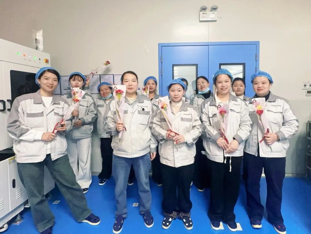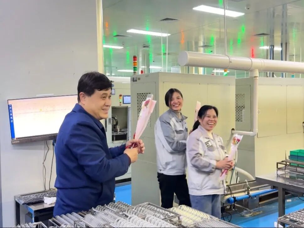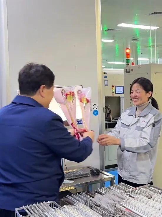 罗跃忠与一线女工亲切交谈,勉励大家继续发扬“巾帼不让须眉”的精神,在岗位上绽放光彩。收到鲜花的女职工们笑意盈盈,有的将鲜花别在工装口袋上,有的与同事分享喜悦,生产线上洋溢着温馨的节日氛围。