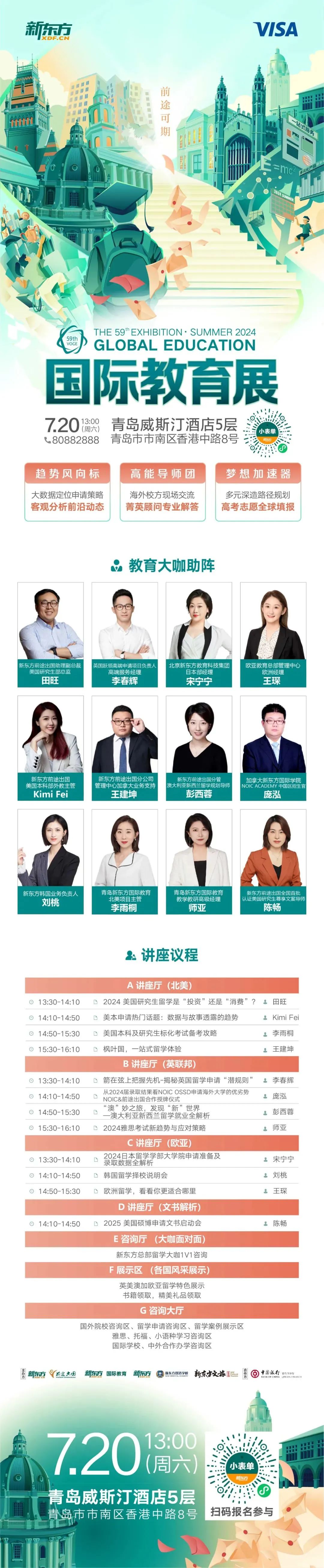 无论你是对国际教育还是升学规划有怎样的困惑,相信在这里都能找到你想要的答案。新东方第59届国际教育展青岛站,7月20日13:00,只等你来!