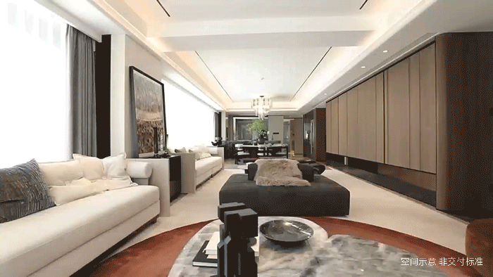 比如在275㎡房型内,客户可以享受到超80㎡大横厅,270度全景落地窗,再加上整个横厅公共区域做了无“门”处理,一眼望去没有丝毫的空间界限感,室内的美好与室外的美景交相辉映。
