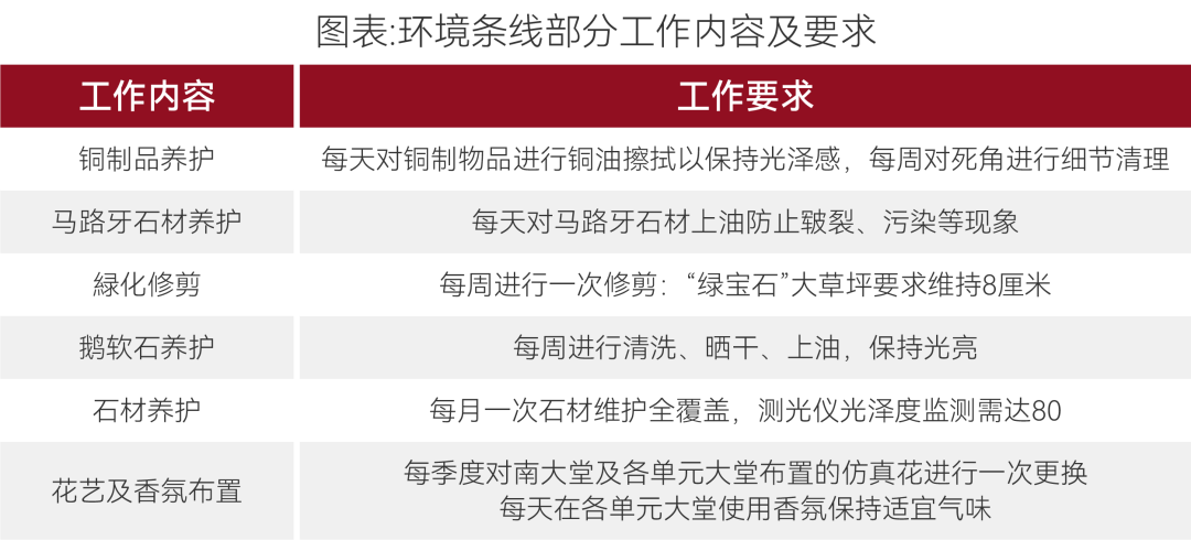 融创的工作要求充分展现了其对“极致”的理解。比如,暖季草坪高度要保持在8厘米,让外滩壹号院社区绿化享有“绿宝石”之誉;每天对园区铜制物品进行铜油擦拭以保持光泽度;每月一次石材维护全覆盖,测光仪光泽度监测需达80;连鹅软石这些看似不起眼的地方,都会每周进行清洗、晒干、上油……