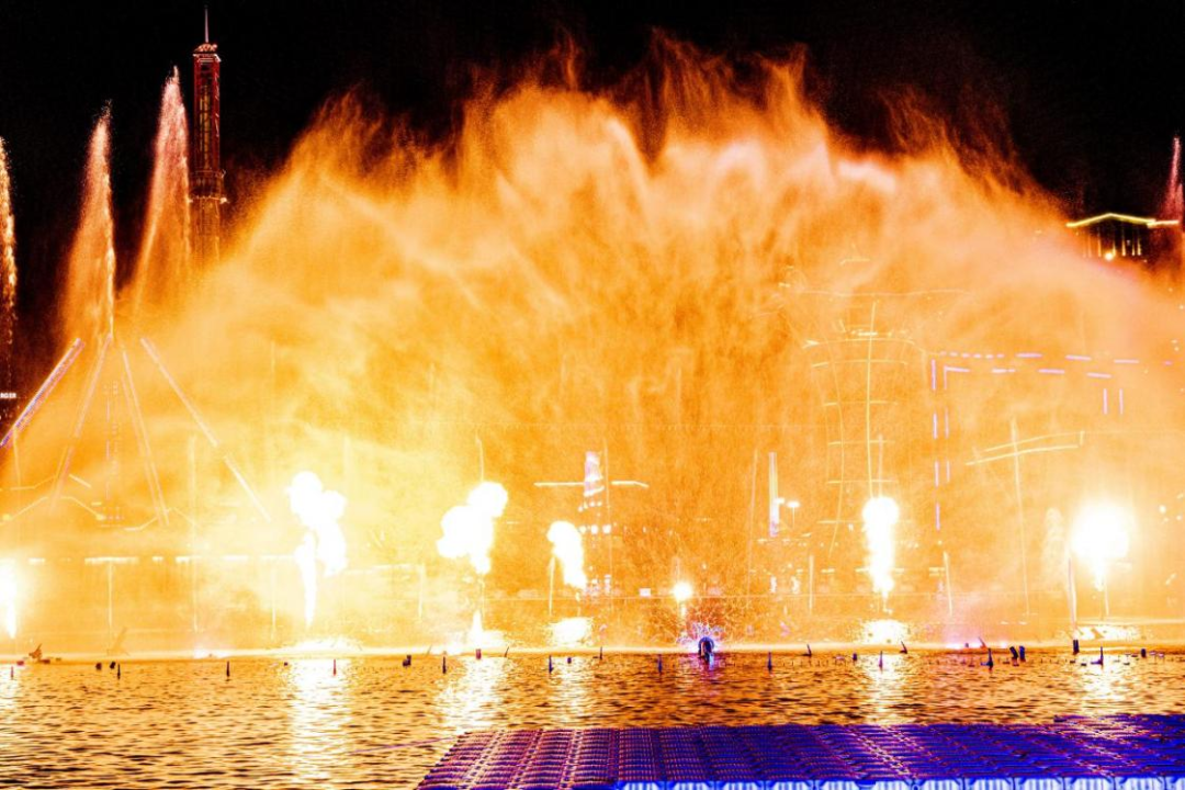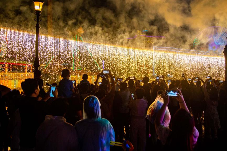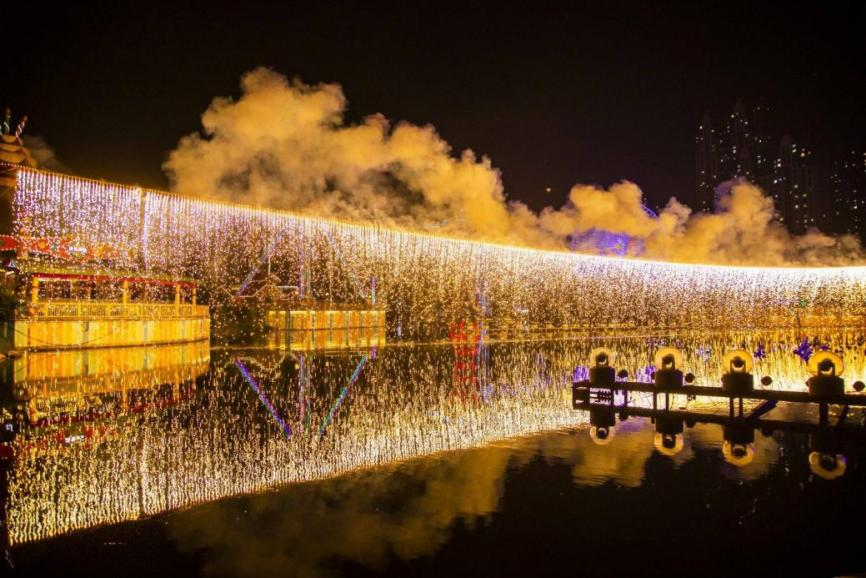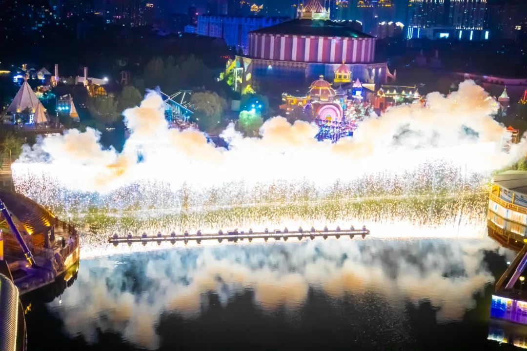 《奇幻声光秀》—大湖秀,是哈尔滨融创文旅城今年的重磅作品,它结合了当代前沿的声光投影、大规模智能水舞、立体声效、水幕等舞台技术手段,并由演艺团队精心创排而来。 为了给游客呈现出一场场令人叹为观止、绝美的百米焰火演出,哈尔滨融创团队跨越 3000 公里的距离,邀请来自湖南浏阳河的专业焰火团队,别出心裁地确定了不在高空燃放,而是向下悬挂近 1000 组燃点的独特方式,精心策划成绵延长达 200 米的焰火瀑布。 其中的一大挑战,是工作人员要横跨宽达近 200 米的辽阔湖面,把那细小却又沉重无比、近乎 90斤的钢丝绳牵引到对岸。完成这项工作,只能让钢丝绳安装人员划船作业。他们既要抵御湖面时有时无的风力保持平衡,又要在划船的过程中万分小心地穿过间距不足 3 米的喷泉设备,难度极高。但最终,融创团队还是精准地完成悬挂,保证了效果。当百米大湖焰火瀑布在园区中心大湖上缓缓开启,耀眼的焰火横跨整个湖面,似瀑布一样缓缓流淌,仿佛时间就此定格,只剩空中万千花火绽放,浪漫至极。“一场不能错过的大湖秀,看多少次都看不够”。大量游客驻足观看,并为大湖秀留下了高分好评。今年暑期,哈尔滨融创文旅城总客流量突破280万人次。人流涌动,客流量直线上升,上扬的数据印证着“尔滨”文旅的热度,彰显着“尔滨”的经济活力。
