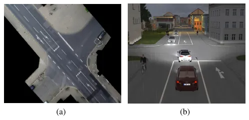 图6. 十字路口的场景布局。(a) inD数据集中模拟路口的实际照片(Bock et al, 2020)。(b) VTD根据实际情况所产生的模拟环境。
