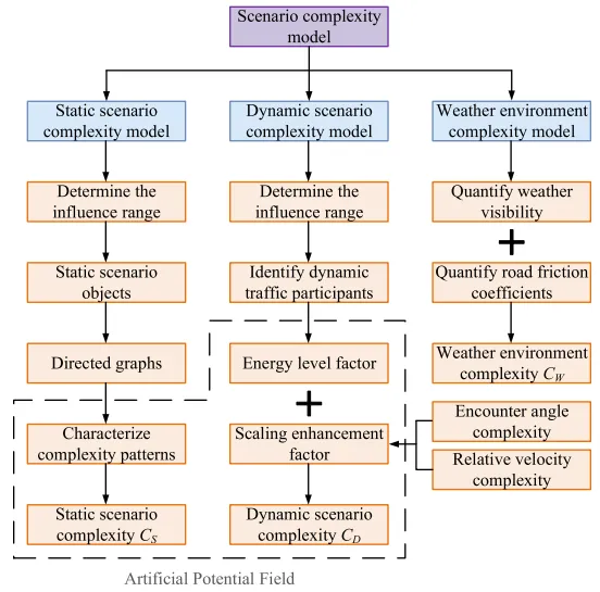 图2. 场景复杂性模型的总体体系结构。场景复杂性模型分为静态场景复杂性模型、动态场景复杂性模型和天气环境复杂性模型三种。采用人工势场法作为场景复杂性计算模型的基础。