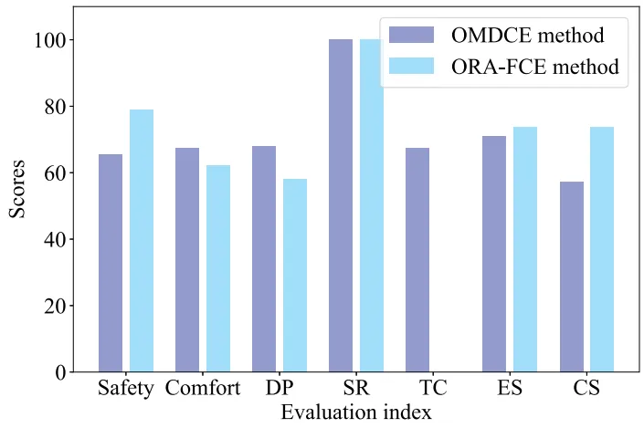 图12. OMDCE法与ORA-FCE法在现场试验中的比较。DP表示驾驶性能指标。SR表示标准规则度量。TC为交通协调度量。ES为评价分数。CS为综合得分。