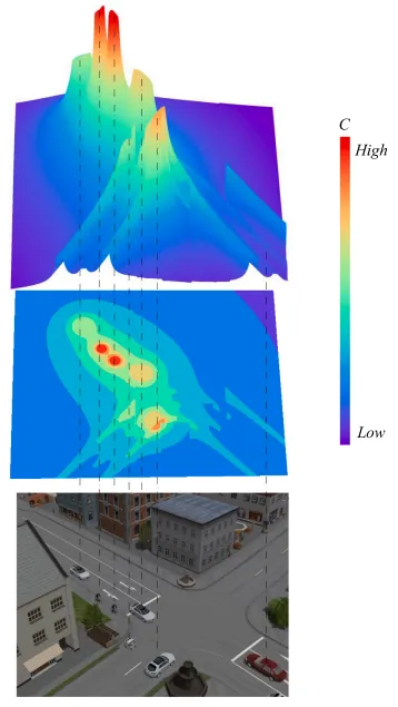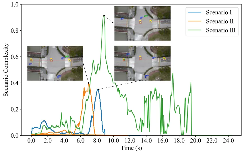 图11. 驱动场景复杂性量化结果用于现场测试。图中的三个快照对应于复杂度峰值时的场景。