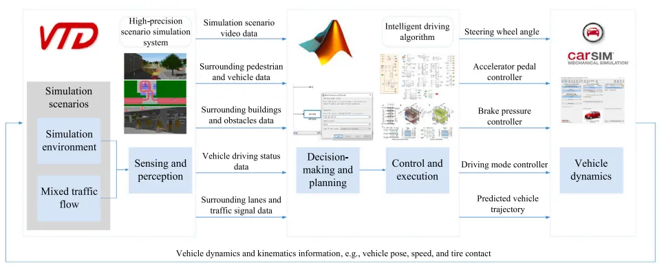 图3. 协同仿真平台工具链的体系结构。该联合仿真平台主要由VTD、Matlab/Simulink和CarSim三部分组成。VTD提供高保真场景模拟和复杂混合交通流场景构建。Matlab/Simulink负责嵌入不同类型的智能驾驶算法。CarSim提供高精度的车辆动力学仿真。