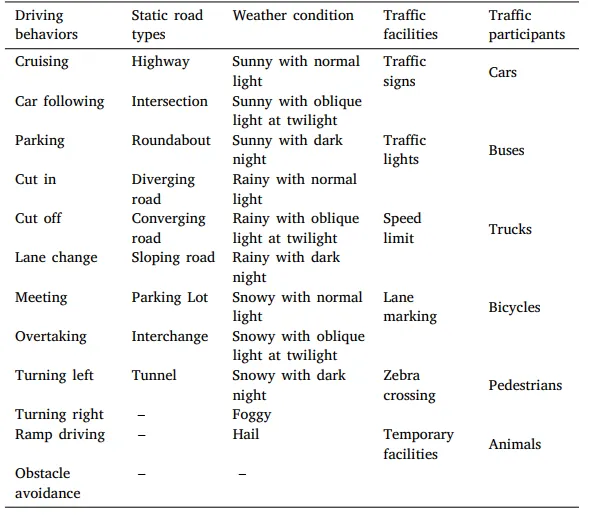 基于以上方法,我们构建了一个包含约1000个不同类型测试场景的场景库。表1总结了自然驾驶数据集的详细信息、采集地点、数据量以及基于自然驾驶数据生成的测试场景数量。基于上述数据集,我们构建了一个测试场景库。测试场景库的详细信息如表2所示。驾驶行为主要包括巡航、跟车、停车、超车、截道、变道、交汇、超车、左转、右转、坡道驾驶、避障等。静态道路类型包括高速公路、十字路口、回旋处、分流道路、汇合道路、坡道、停车场、立交、隧道等。在不同的光照条件下,天气条件包括晴天、雨天、雪天和雾天。交通设施包括交通标志、红绿灯、限速、车道标线、斑马线和临时设施。此外,在交通参与者方面,我们考虑了汽车、公共汽车、卡车、自行车、行人和动物。驾驶行为、静态道路类型、天气条件、交通设施和交通参与者的各种组合构成了测试场景库。在每次模拟测试过程中,智能驾驶测试系统可以根据每个测试场景的复杂程度自适应选择不同复杂程度的场景。此外,还可以在线生成各种场景进行实时测试。测试场景的自动选择主要基于下一节中的场景复杂性模型。