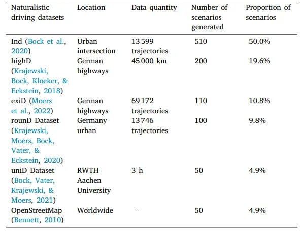 在自然驾驶场景(NDS)生成部分,基于真实交通数据进行机动识别和分析,得到车辆、自行车和行人的自然驾驶行为分布模型。然后,将真实的交通场景转换为仿真平台下的自然驾驶模拟测试场景。接着,我们从静态交通场景和动态交通场景两方面实现了关键边界场景库的生成。其中,静态交通场景主要考虑自动驾驶汽车的可行驶区域、天气能见度和道路摩擦系数。动态交通场景主要考虑由自动驾驶汽车、HVs、自行车和行人组成的混合交通流对被测自动驾驶汽车的影响。基于场景复杂度模型,通过在线环境参数优化生成不同复杂度的测试场景。静态交通场景是从实际道路环境中生成的。生成的静态交通场景与真实道路环境高度相似。静态交通场景的复杂性根据可驾驶区域、天气能见度和道路摩擦自适应调整。动态交通场景是由自动驾驶汽车、HVs、自行车和行人组成的混合交通流生成的。动态交通场景是智能驾驶测试场景的核心组成部分,也是最容易发现自动驾驶性能边界的场景。为了使生成的临界边界驾驶场景(critical boundary driving scenarios, CBDS)在兼顾客观性和有效性的前提下满足自然分布,我们利用inD数据集中的自然驾驶数据(Bock et al, 2020)生成CBDS。CBDS的生成是通过优化主要交通参与者的行为来实现的。