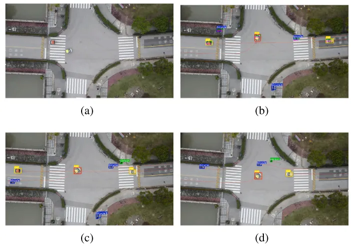 图10. 现场测试的实际照片。(a)实地试验场的实际照片。(b)测试场景一的摄像头快照。(c)测试场景二的摄像头快照。(d)测试场景III的相机快照。
