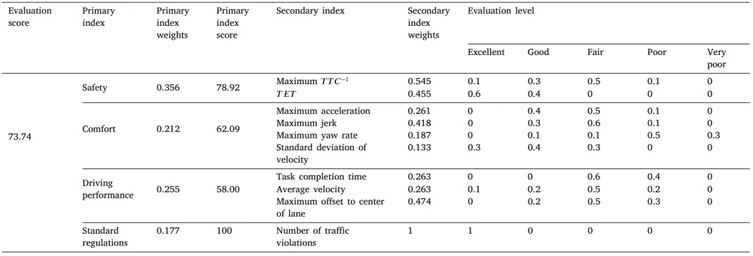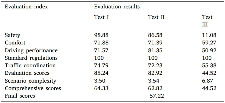 基于评价指标权重和效用函数,我们可以计算出每个评价指标的具体性能分数和被测自动驾驶汽车的综合性能评价分数。