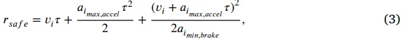 在驾驶过程中,考虑到并非所有交通参与者都对自动驾驶汽车的动态场景复杂性有贡献,我们首先量化了自动驾驶汽车周围区域的影响范围。我们将自动驾驶汽车的影响范围用一个以汽车后部为中心的半圆来描述。自动驾驶汽车不仅需要确保不会与之发生冲突的车辆发生碰撞,还需要确保不会与前方车辆发生追尾。参考责任敏感安全(shalev - schwartz, Shammah, & Shashua, 2017),我们将自动驾驶汽车影响区域的半径公式定义为: