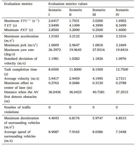 在评价指标体系中,安全性主要通过替代安全措施进行评价(Rahman, Abdel-Aty, Lee, & Rahman, 2019)。本文选择了三种常用的驾驶安全指标:碰撞时间(TTC)、碰撞暴露时间(TET)和侵占后时间(PET)。舒适性关注的是乘客在驾驶时的感觉,包括由于智能驾驶系统的缺陷导致的不规律驾驶、急刹车、急转弯。对于自动驾驶汽车来说,这并不是自动驾驶汽车本身的座椅设计带来的舒适性问题,而是智能驾驶算法能否平稳地控制自动驾驶汽车,避免频繁的剧烈运动。我们使用最大加速度、最大颠簸、最大偏航率和速度标准偏差来表示驾驶舒适性。