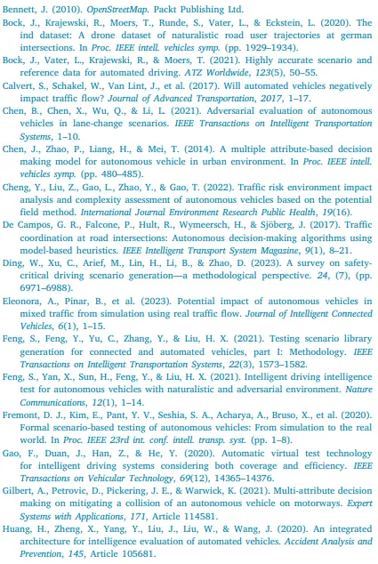 智能驾驶测试对于自动驾驶汽车的实际开发和部署是必要的。大多数现有的方法都是通过逼真的模拟或道路测试来测试自动驾驶汽车的安全性。然而,这些方法存在效率低下和安全风险高的问题。为了解决这些问题,人们提出了基于场景的智能驾驶测试方法。Feng, Yan等(2021)让背景车辆(bv)执行对抗性机动来测试自动驾驶汽车。Li等(2019)建立了虚拟-真实交互并行测试系统,以实施具有挑战性的测试,从而加快自动驾驶汽车的评估和开发。Chen等人(2021)提出了一种自适应评估框架,用于评估深度强化学习生成的变道场景下的智能驾驶系统。Tuncali, Fainekos, Prokhorov, Ito和Kapinski(2020)使用信号时间逻辑来评估测试用例并自动探索特定类型的故障用例。Fremont等(2020)使用形式化方法测试了基于机器学习的自动驾驶汽车的安全性。此外,Gao, Duan, Han, and He(2020)提出了一种用于测试场景生成的组合测试方法,以提高测试覆盖率和测试效果。Li, Zheng, and Wang(2021)在分析自动驾驶汽车的智力测试时引入了可能近似正确的概念。
