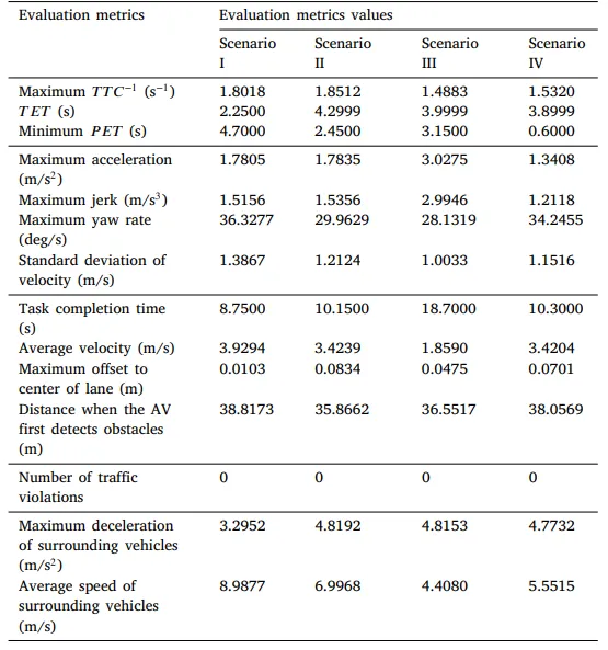 表3 VTD自动驾驶模型在不同场景下的评价指标值。
