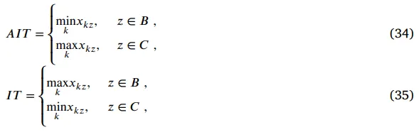 评价矩阵如式(26)所示。通过在评价矩阵的基础上定义理想自动驾驶汽车和非理想自动驾驶汽车,得到扩展的评价矩阵。反理想试验值(AIT)是最差评价度量值,理想试验值(IT)是最佳评价度量值。根据参考序列的性质,应用式(34)和式(35)定义AIT和IT: